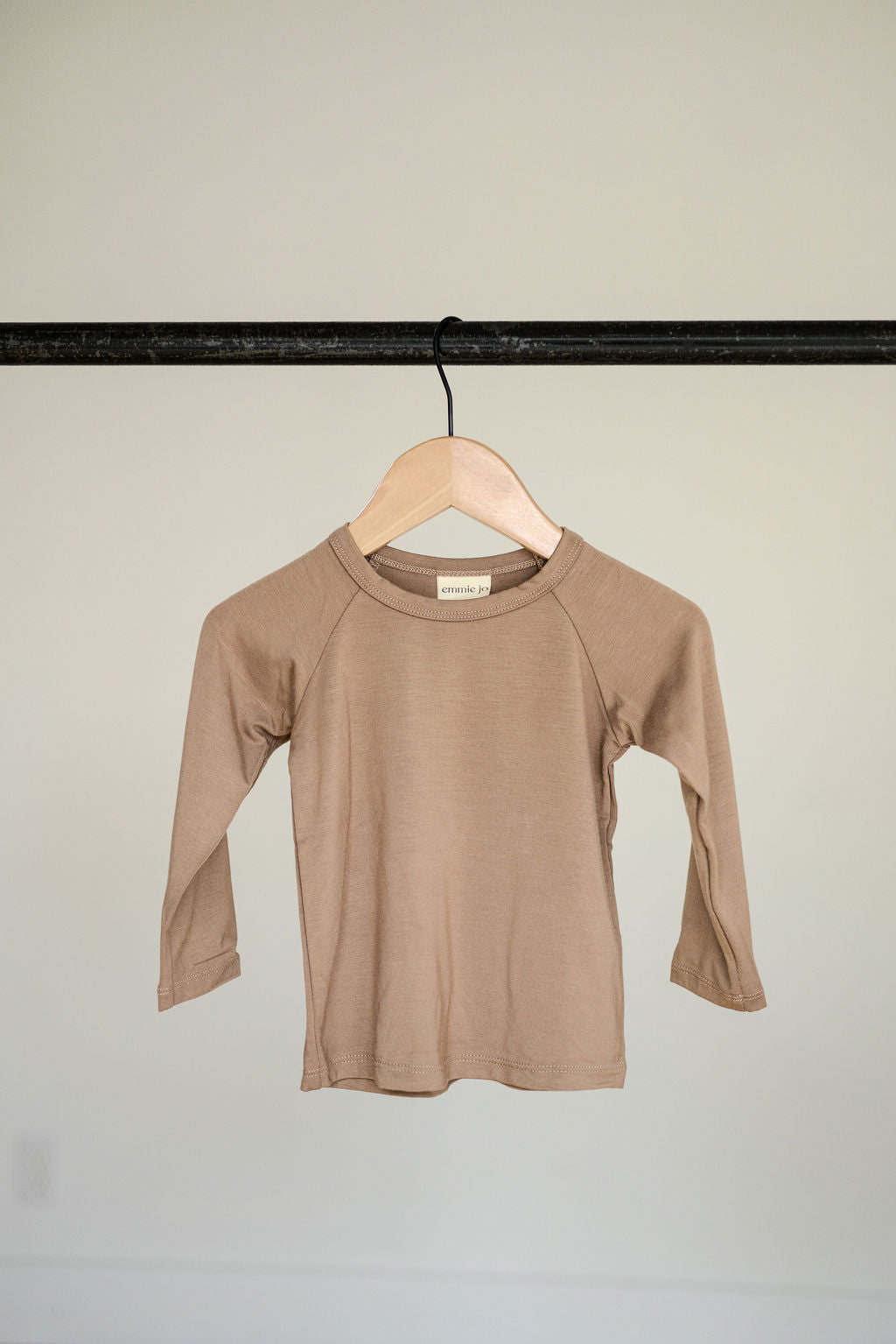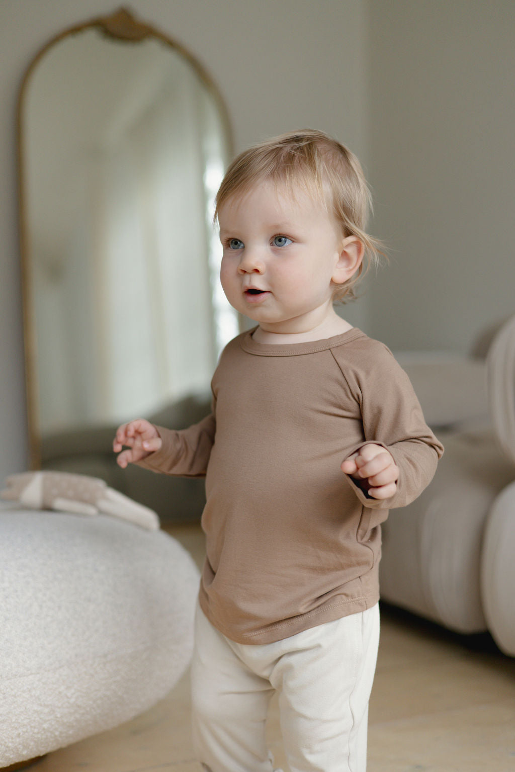 Our Kids Raglan Longsleeve Shirt is back for the season. Made from our soft signature bamboo jersey, the longsleeve shirt is comfortable and breathable. This shirts is more fitted than our Oversized Longsleeve and Lounge Crewneck.