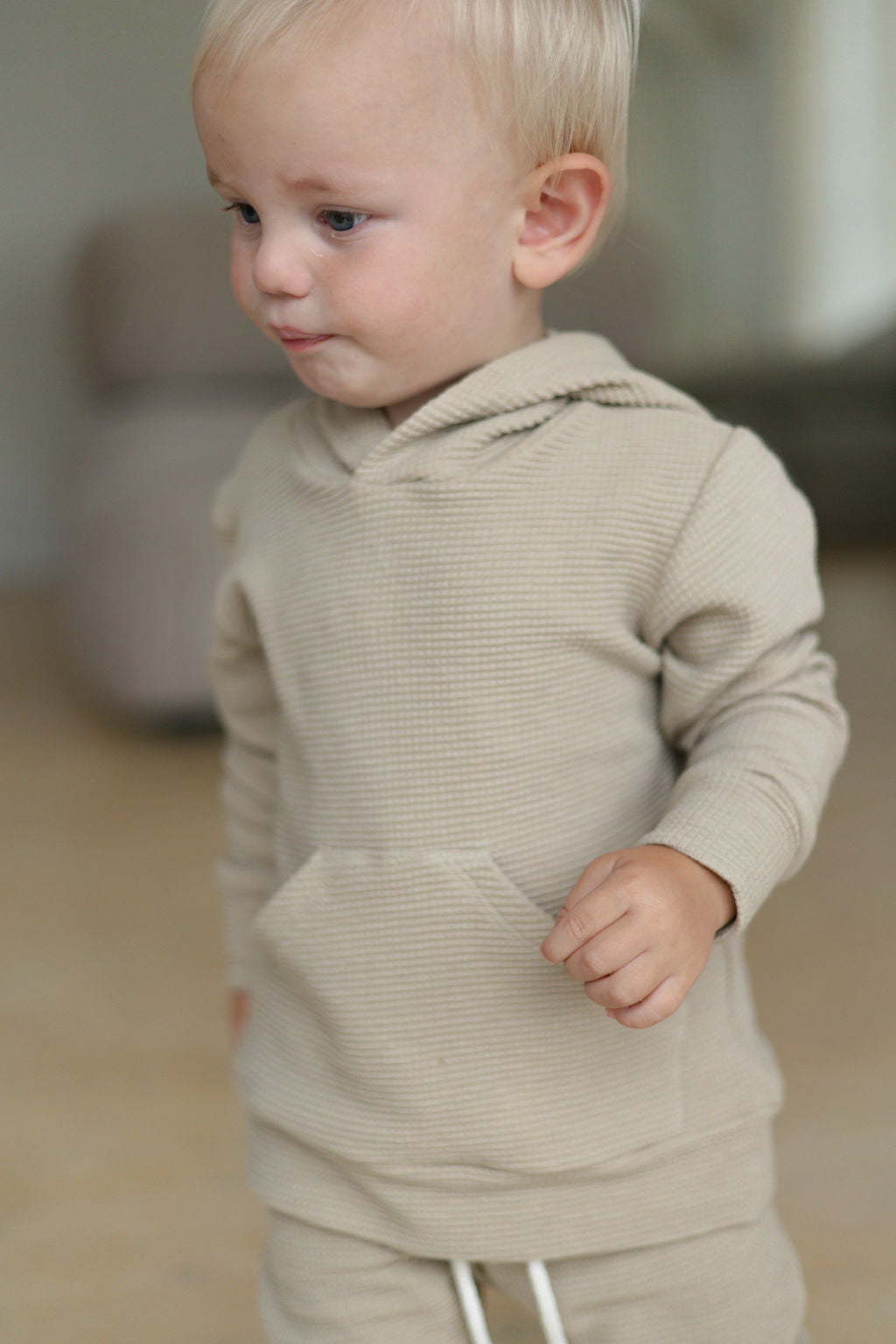 Our new Kids Waffle Knit Hoodie is the perfect hooded sweatshirt for everyday lounging and playing. This hoodie features a casual fit and front pocket and is made from buttery-soft organic cotton. Pair it with our new Waffle Joggers and Toque for the perfect fall and winter outfit.